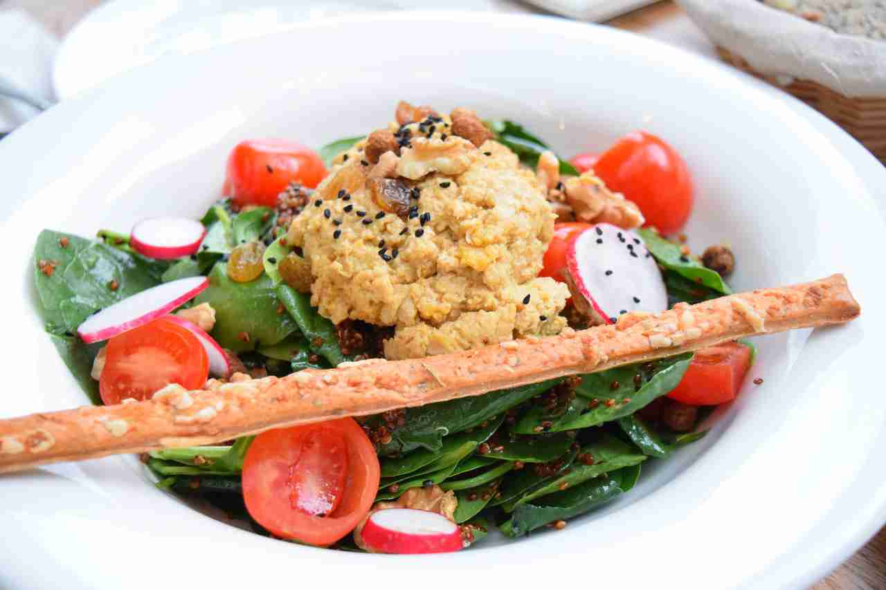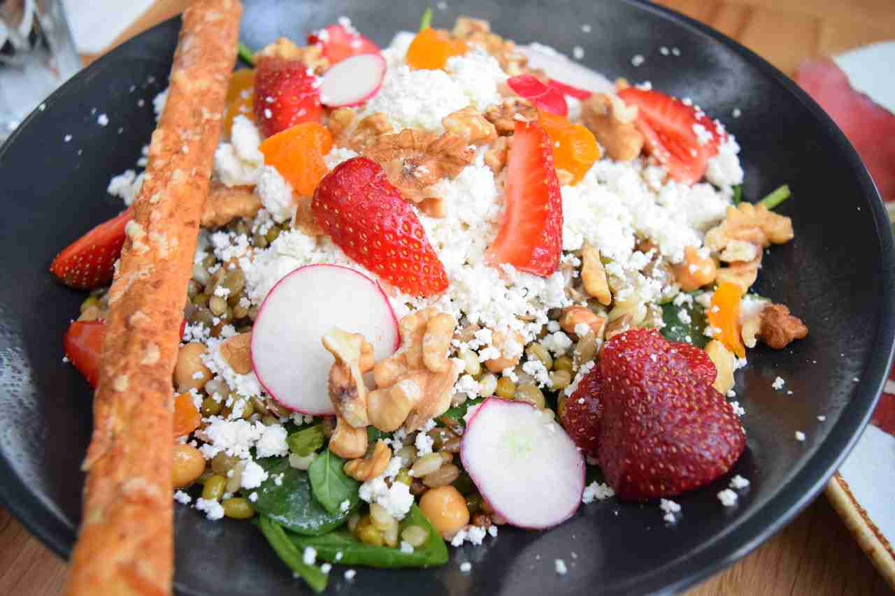 Önce salatalardan başlamak istiyoruz. Dışarıda salata yiyen insanlardan olamadık. Dışarıda salata yiyen insanları da anlayamadık bugüne kadar. Genelde minnacık porsiyonlara dünya para ödüyorsunuz ve doyurucu gelmiyor bize. Beyaz Fırın’ın salataları çok övülünce denemek istedik. Çilekli lorlu tahıl salatası ve humuslu kinoali salata söyledik. Porsiyonlar oldukça doyurucu. Salatalar hem göze hem mideye hitap ediyor. Her ikisine ayrı ayrı bayıldık. Standart salatalardan sıkılanlara burada alternatif çok.