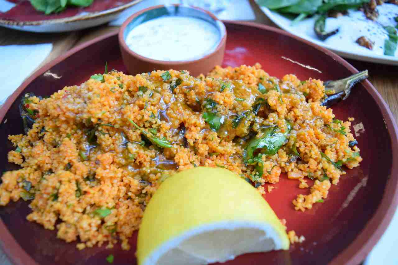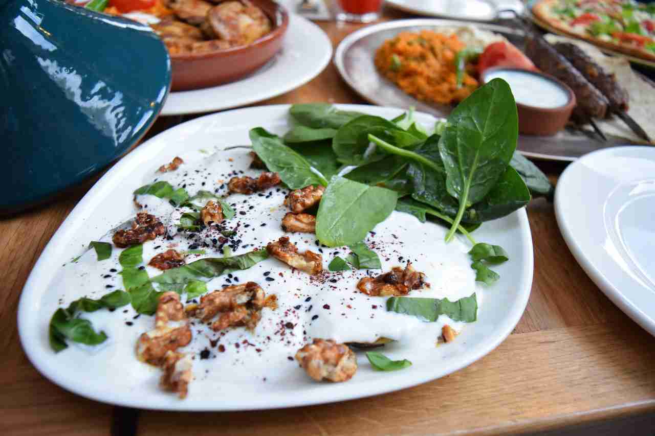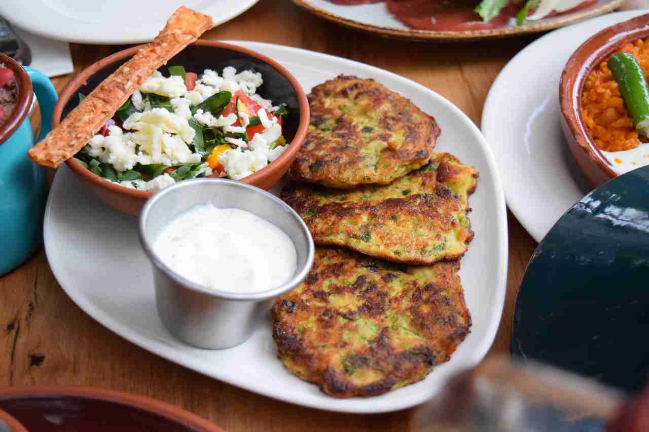 Başlangıçlardan ceviz krokanlı yoğurt patlıcanı çok ilginç ve lezzetli bulduk. Menüde Nathalie Stoyanof Suda‘nın dokunuşları hissediliyor. Kadının özeni menü tasarımından yemeklere ve yemeklerin sunumuna kadar her şeye yansımış. Hellim peynirli kabak mücver çok yağ çektirilmeden hazırlanmış, yanında yoğurt sos ve mini salata ile servis ediliyor.