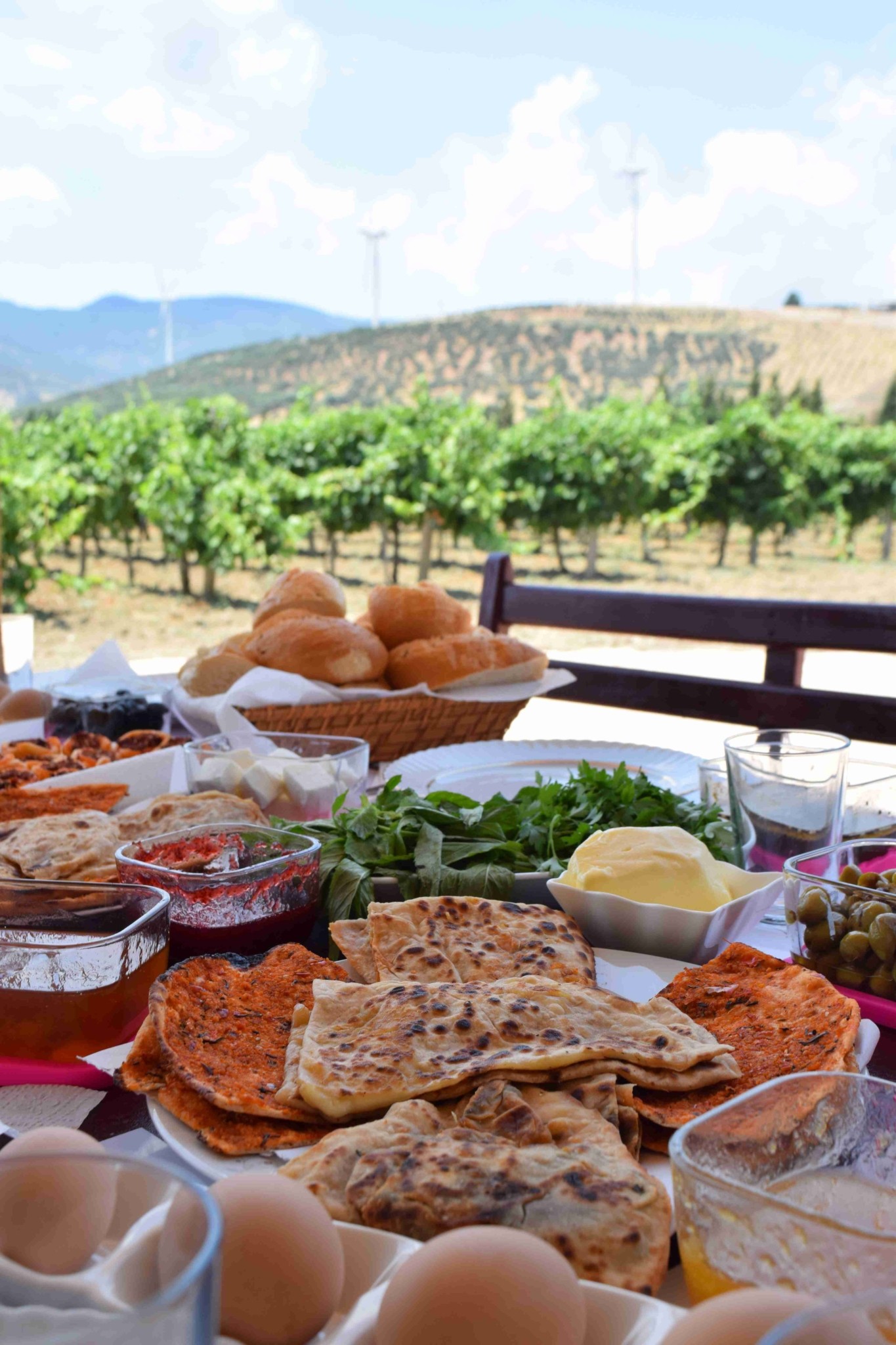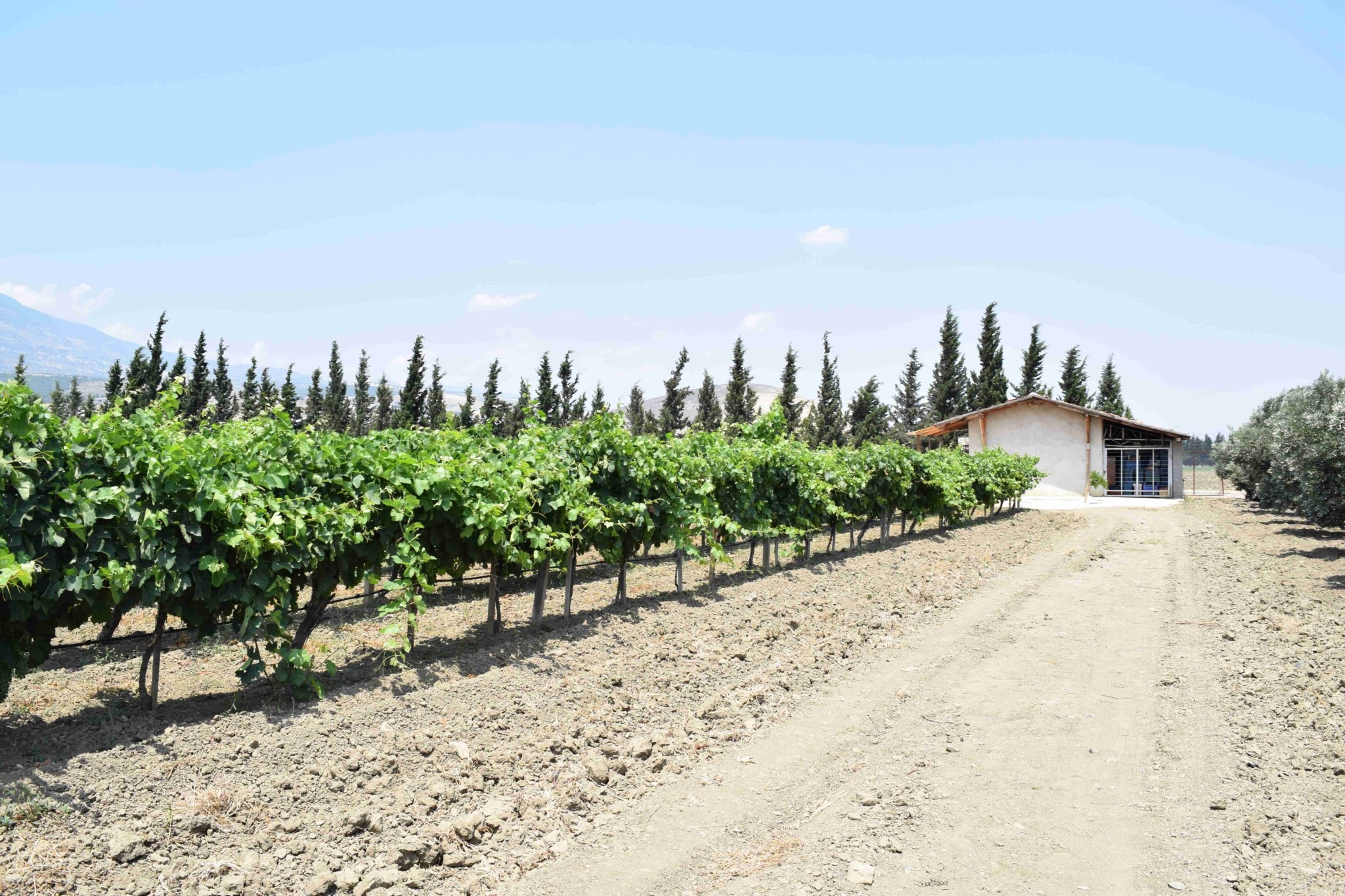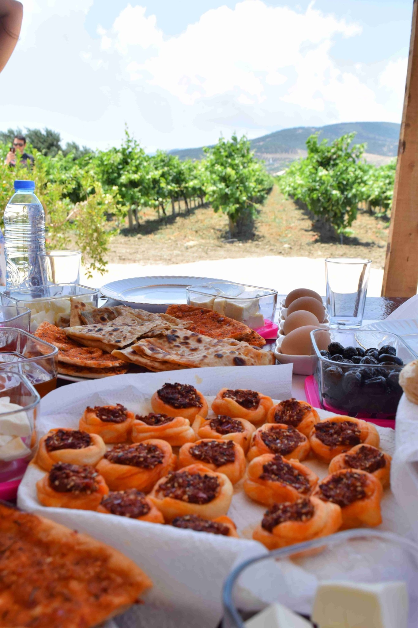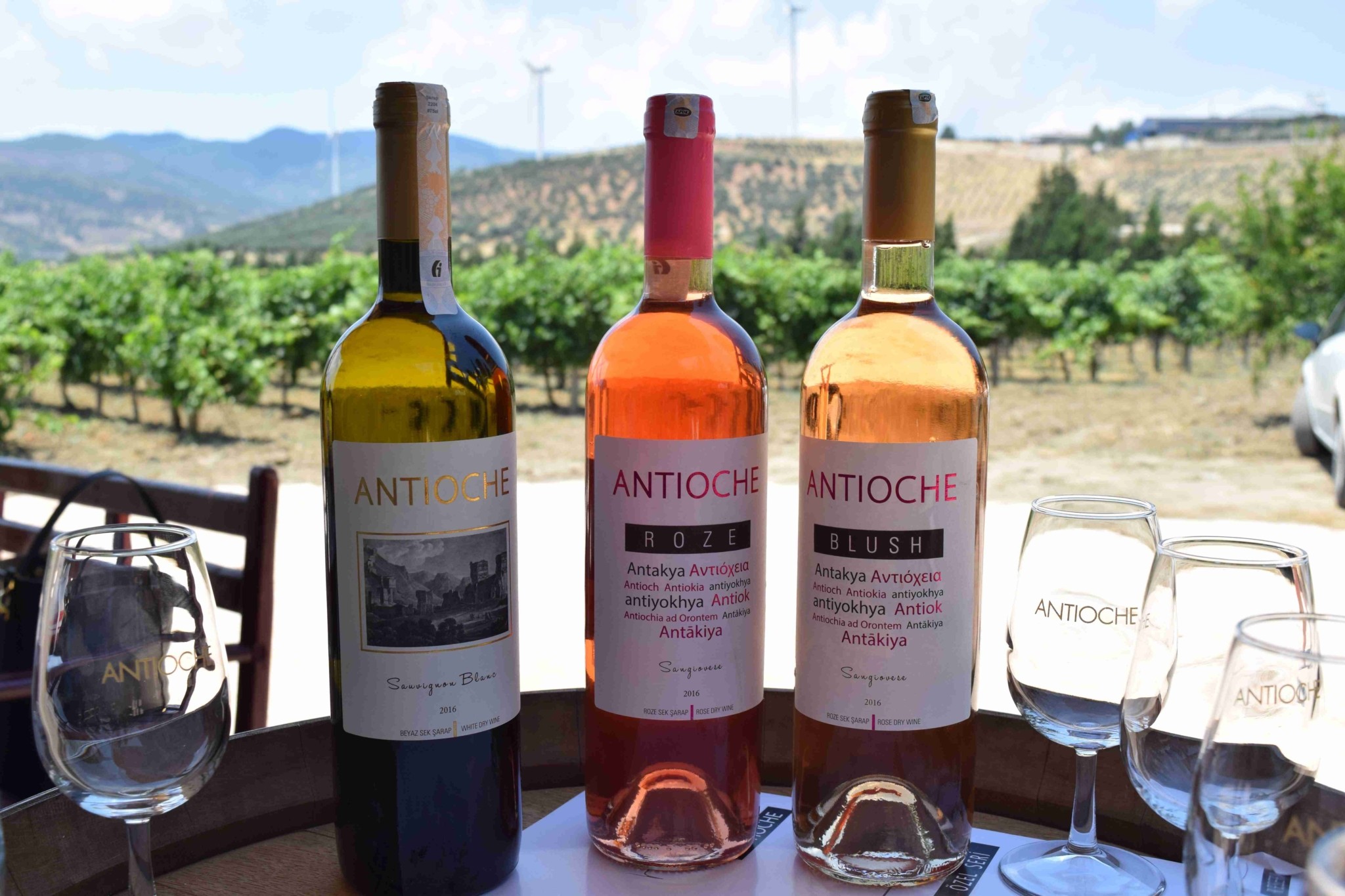 Hatay’ın yöresel lezzetleri ile donatıldığı harika bir sofrada asmaların arasında kahvaltı yaptık. Burası Hatay’daki şarap üreticimiz Antioche‘un bağları. Bölgenin en büyük havlu üreticisi olan Hateks’in sahipleri şaraba meraklı olunca şarapçılık işine girmek istemişler. Özellikle sıcak havanın zorlayıcı bir etken olduğu bu bölgede bağlar önolog Saba Açıkgöz‘ün denetimde. Asmaların arasında gezinti yaparken kısa bir süre içerisinde güneş altında yandık. Havanın serin olduğu saatlerde bağı görüp gezmeli.