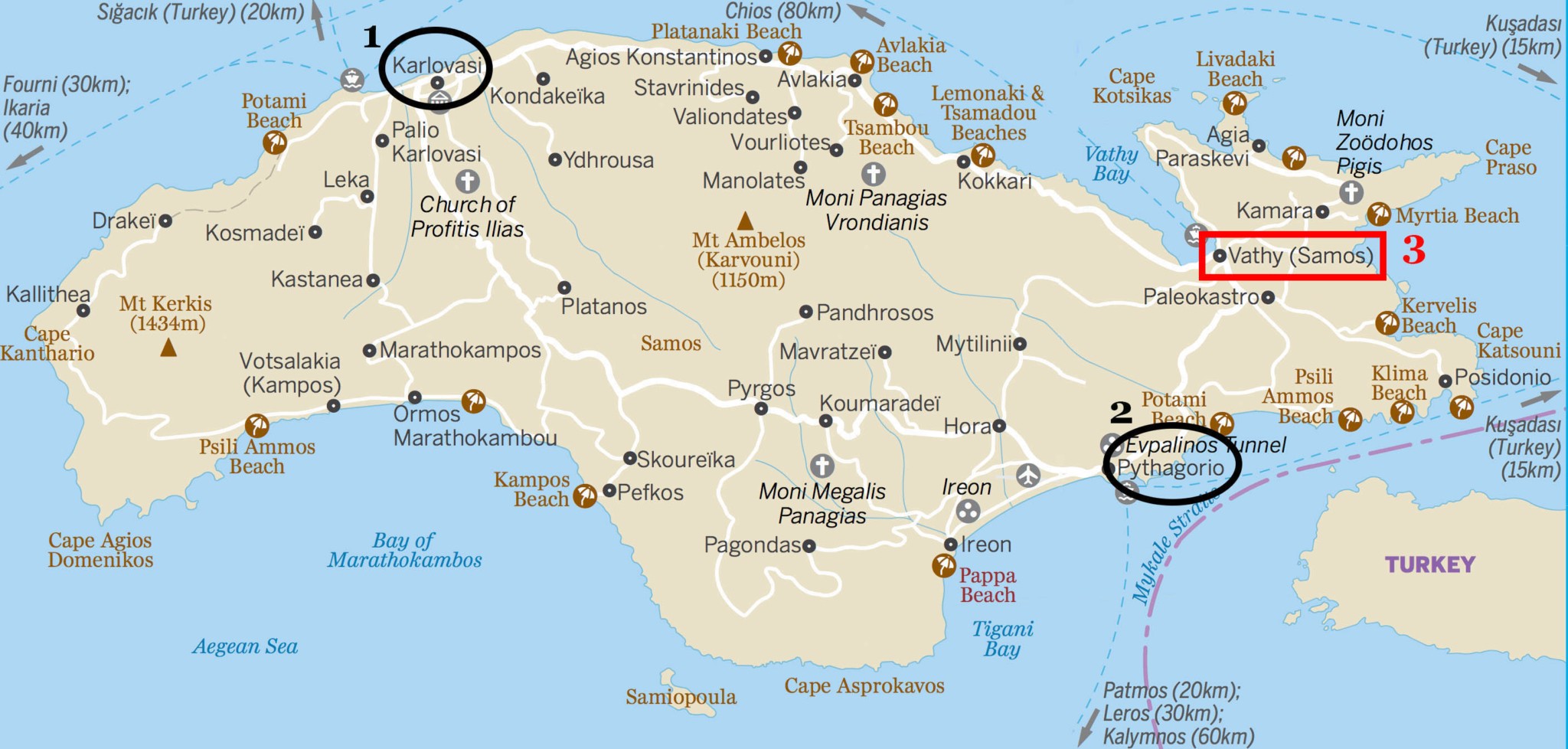 Adada 3 adet liman bulunuyor. Bunlar biri adanın merkezi olarak belirtilen Samos’taki Vathi limanı, diğeri Pythagorion limanı ve sonuncusu ise Karlovasi limanı. Samos’a Kuşadası’ndan kalkan feribotlarla ulaşabilirsiniz. Seyahat süresi 90 dakika. Feribotlar Vathi ve Pythagorio limanlarına yolcu taşıyor. Pasaport bilgilerinizi girerek Ertürk‘ün sitesinden online bilet satın alabiliyorsunuz. Varış limanınız ile kalkış limanınız aynı olmalı. Biz Vathi limanına inmeyi tercih ettik. Gidiş-dönüş biletleri için toplamda 55 Euro ödedik.