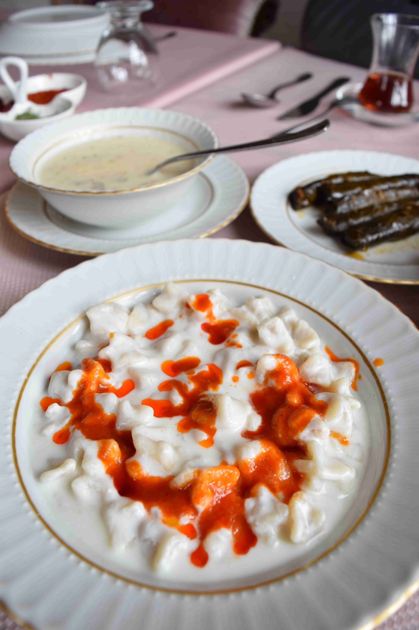 Günün çorbası olarak şansıma en sevdiğim mantar çorbası vardı. Fiyatı 6 TL. Dayanamayıp az porsiyon yaprak sarması da sipariş ettim yanına. Tam porsiyon söylerseniz fiyatı 7 TL. Yan masadaki mantıya gözüm kayınca tadımlık bir de mantı söyleyiverdim. Obur olmak böyle bir şey maalesef. Herkesin tabağında gözüm kalıveriyor. Mantının da tam porsiyon fiyatı 10 TL. Anlaşılacağı üzere fiyatlar gayet makul. Serpme kahvaltı, menemen, erişte çeşitleri, gözleme çeşitleri, salata, tatlı çeşitleri, tost, köfte yemek ve günün yemeğinden oluşan bir menüsü var Kadıneli Restaurant‘ın.